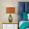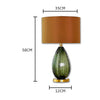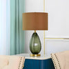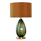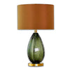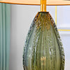 Abajur de alto padrão com base em vidro soprado verde e acabamento dourado. Ideal para compor ambientes elegantes com iluminação suave e refinada.
