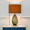 Abajur de mesa sofisticado, com base em vidro soprado verde texturizado e acabamento em metal banhado dourado, ideal para composições elegantes em salas, quartos ou escritórios de alto padrão. A cúpula marrom em tecido de linho com acetato difunde a luz de forma suave, criando uma atmosfera acolhedora e refinada.