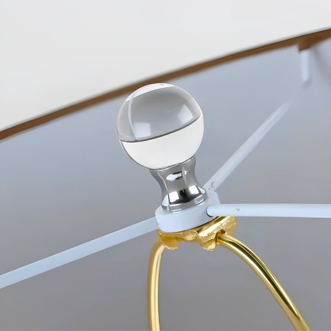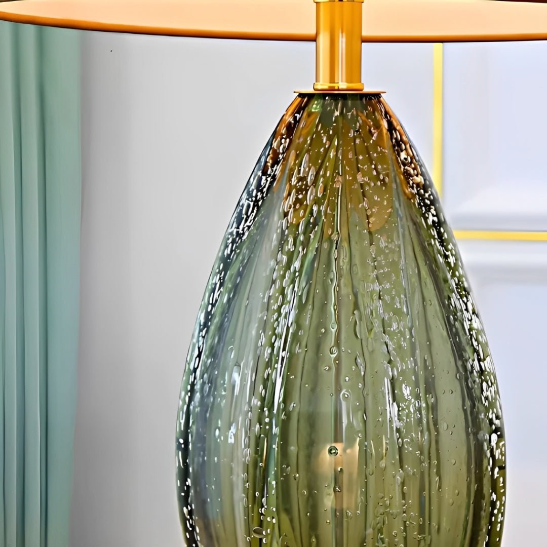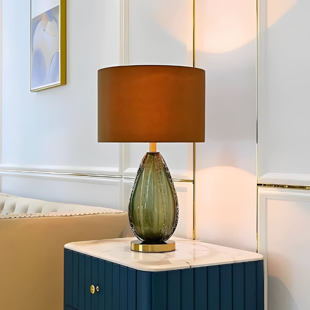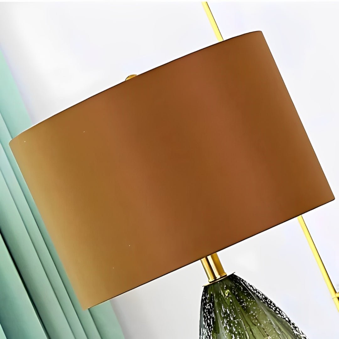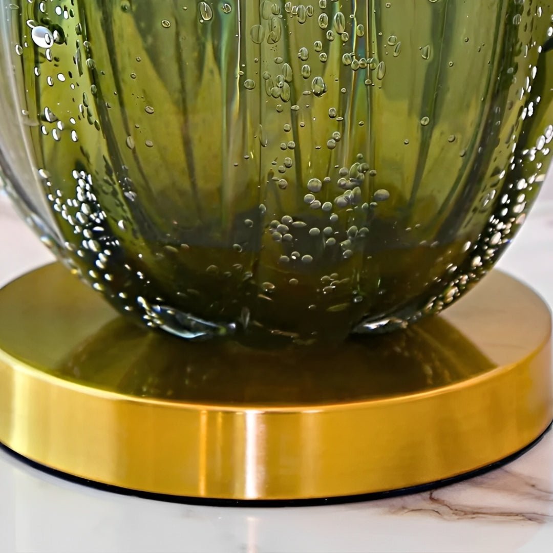 Abajur de alto padrão com base em vidro soprado verde e acabamento dourado. Ideal para compor ambientes elegantes com iluminação suave e refinada.