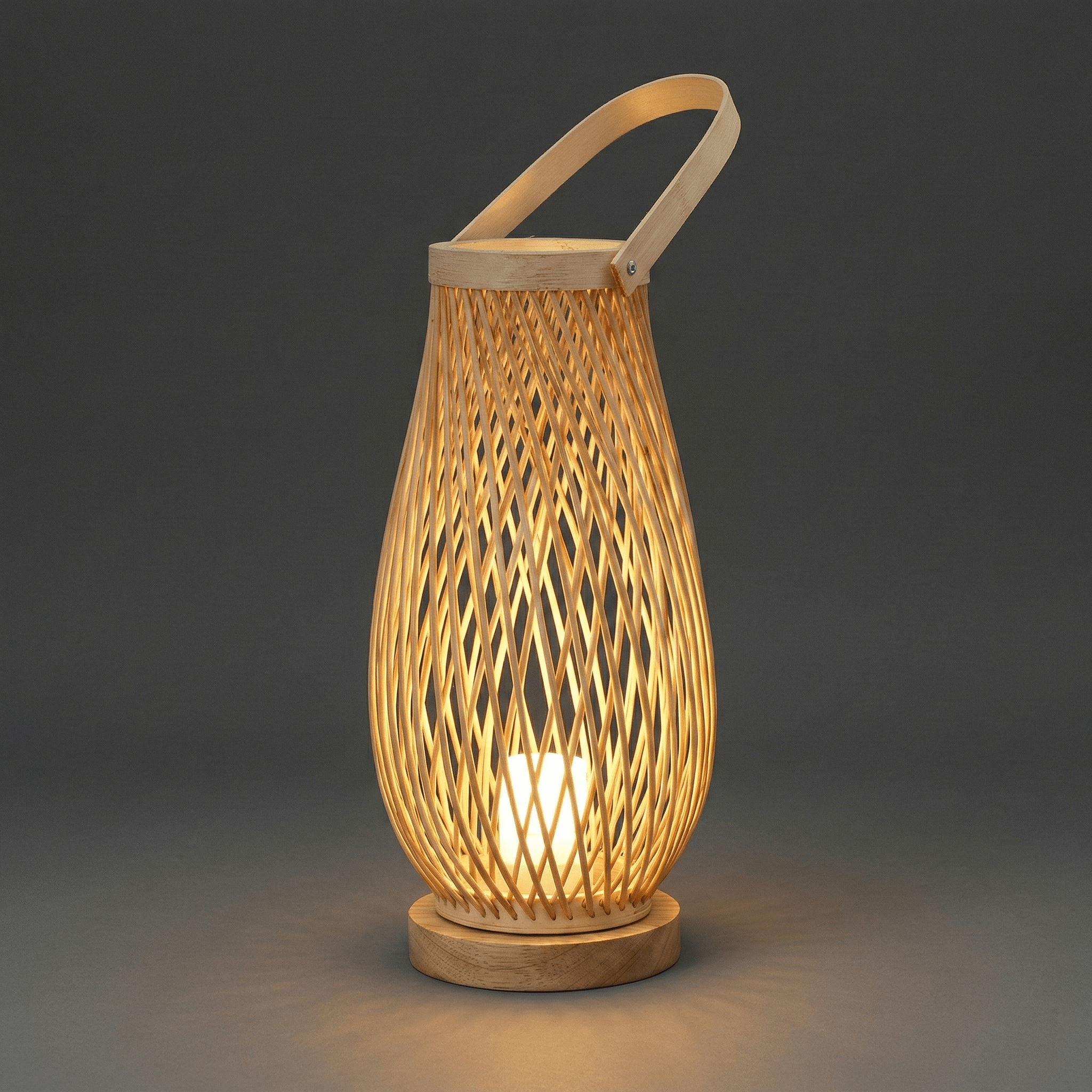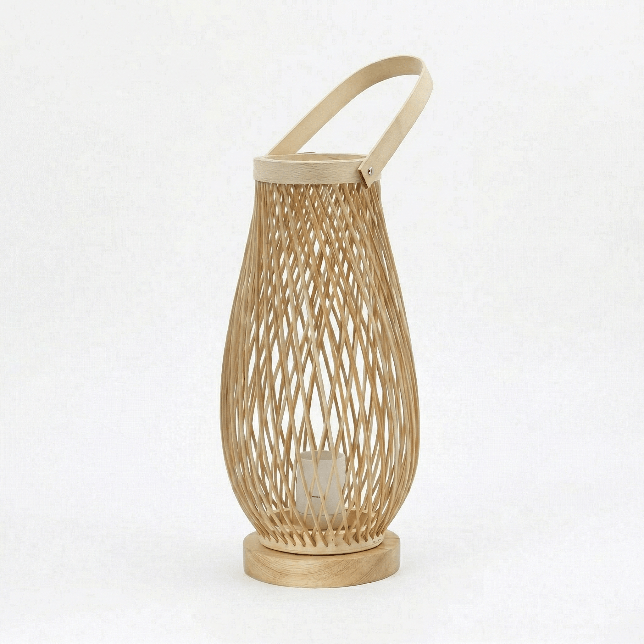 O desenho remete às clássicas lanternas de mão, incorporando uma alça superior que adiciona charme e reforça a identidade visual da peça. A silhueta curva e fluida, construída com hastes finas de madeira e bambu, oferece leveza visual, permitindo que a peça se integre facilmente a decorações estilo boho, escandinavo ou japandi.